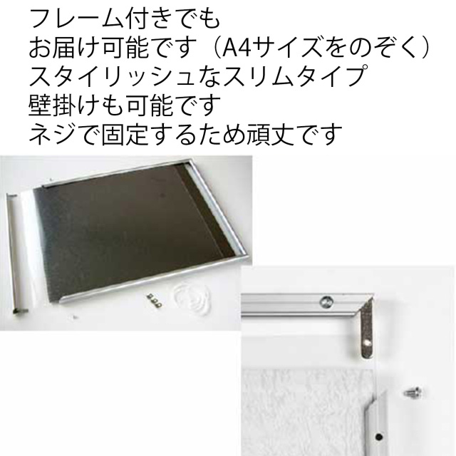 ※通常『ポスターのみ』の販売となりますが、ダイソーなどでもA2サイズまでのフレームが売っています。フレーム付きでのお届けも可能ですが、その際は各サイズ(A4以外)の『フレーム付き』を選択してご注文ください。
