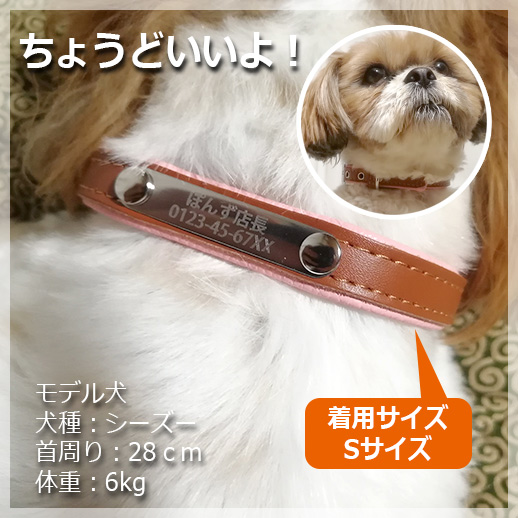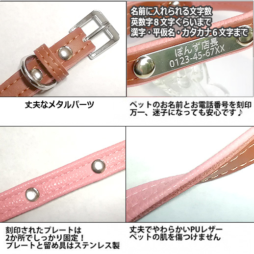 PUレザーのベルトにステンレス製のプレートを固定した首輪です。本体は丈夫でやわらかいPUレザー、ペットの肌にやさしい素材です。プレートにはペットのお名前&電話番号を刻印しますので、迷子対策になります。