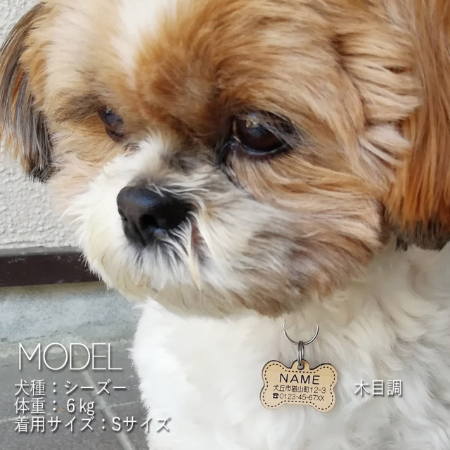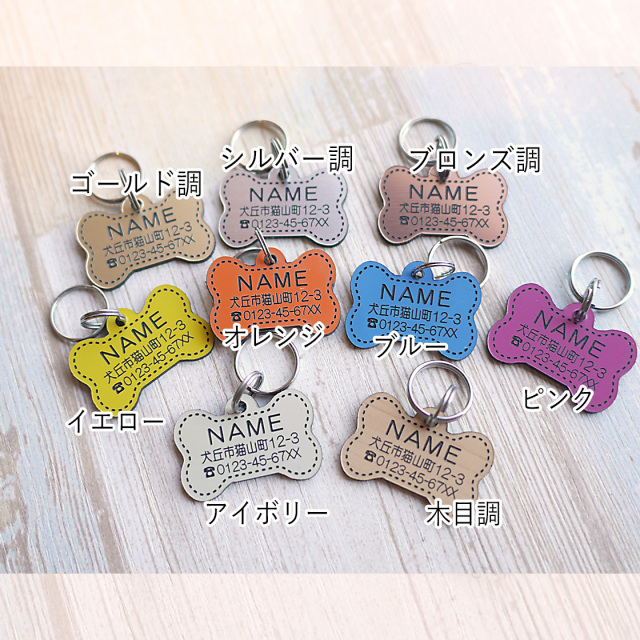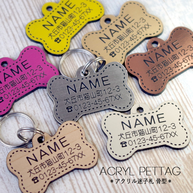 アクリル板を骨型にカットし、ステッチ風にデザインした犬用の迷子札(ドッグタグ)です。アクリル板は看板などにも利用されている素材で軽くて丈夫なだけでなく、金属ではないためサビ・カビにも強いです。