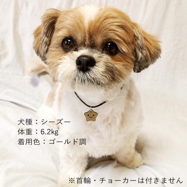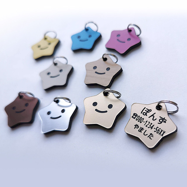 可愛いにこにこマーク入りの星型迷子札です。1円玉とほぼ同じサイズでとっても軽く、小さな猫ちゃん、わんちゃん、ハムスターなどの小動物におすすめです。
