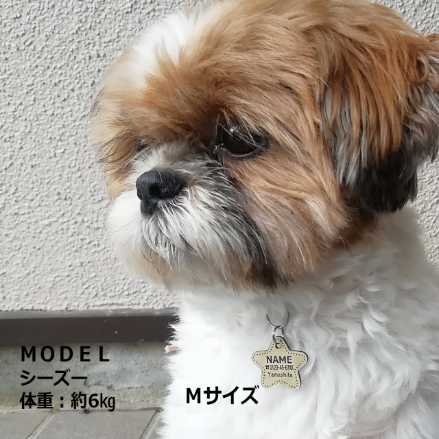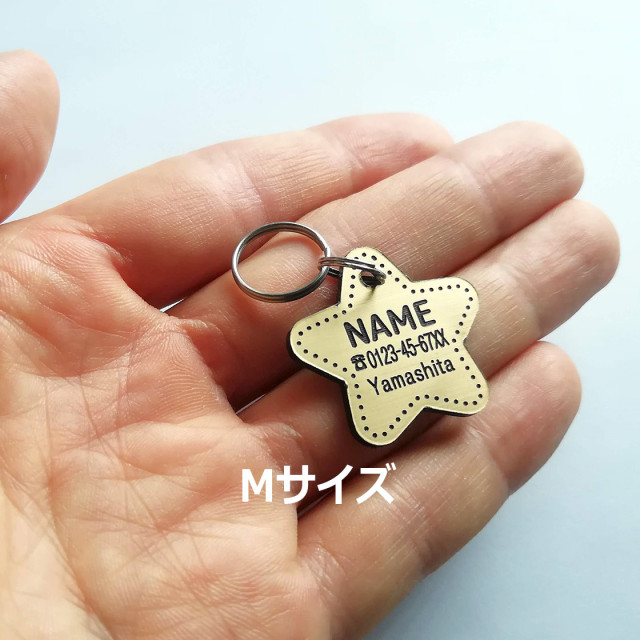 アクリル板を星型にカットして、ステッチ風にデザインした迷子札です。アクリル製でありながら表面はメタリックなゴールド調のテクスチャー加工で高級感があります。
