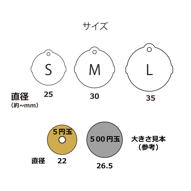 サイズはS、M、Lから選べます(目立たせるため、当店で扱っている他の迷子札の同サイズより少し大きめです)。